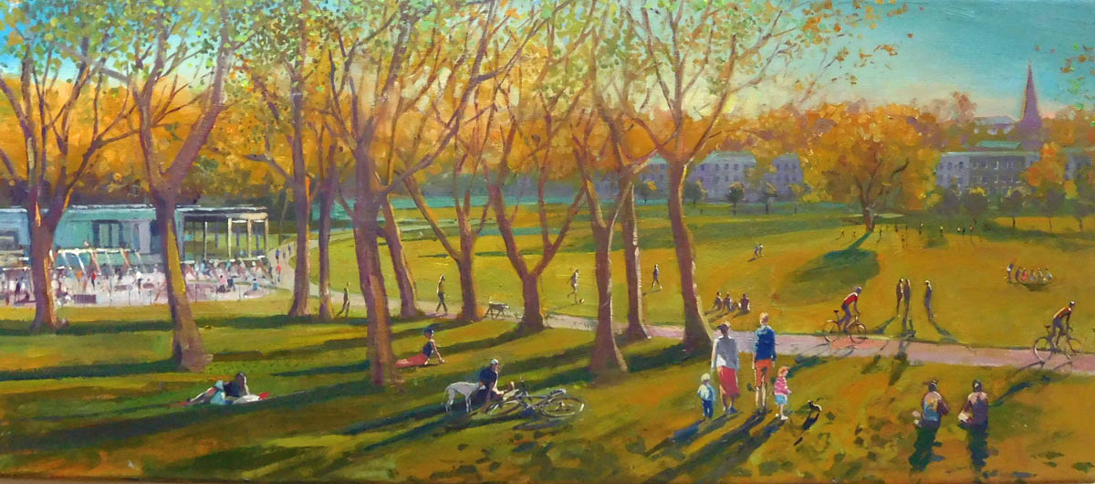 Ruth commissioned Mark to produce a painting for her husband’s 40th birthday. The delightful subject matter was a view from Telegraph Hill looking to the City of London. Mark met the clients in the park to agree on the composition & the key elements that they wanted to be included in the piece. This shows the route they take when the children go to nursery; the family group are depicted on the path. They wanted the atmosphere of the park to reflect the different people using it, e.g. the dog walkers, the tree colours and the accuracy of the buildings were also important. One of the children asked that a cat be included, this can be seen to the left-hand side of the painting in the grass!