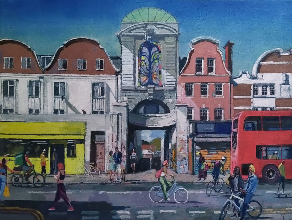 This street scene of Deptford High Street was commissioned by a GP practice as a retirement gift for one of their colleagues, who had been practicing over 30 years in the area and was dedicated to helping his patient in the locality. Most of the figures in the painting are the staff members; using photos and sketches Mark placed them in the composition in different groups.