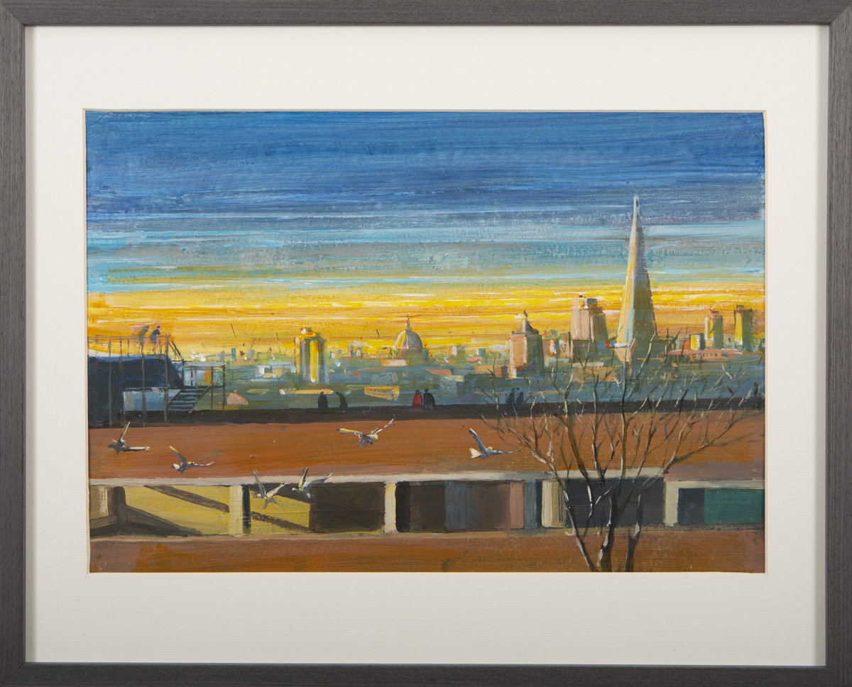 View from the Studio by Mark Pearson shows the stunning view from the artist’s studio at the iconic Bussey Building, looking across to the City of London. Acrylic & ink on paper.